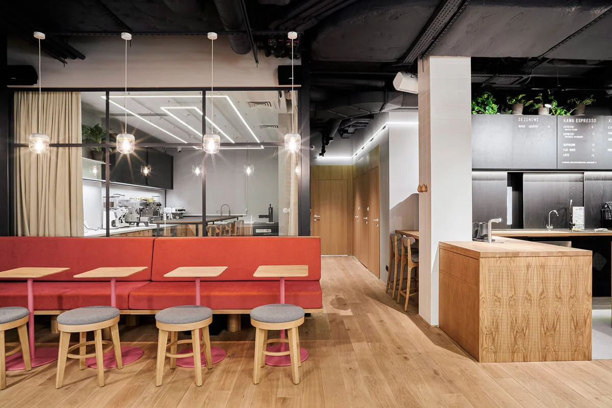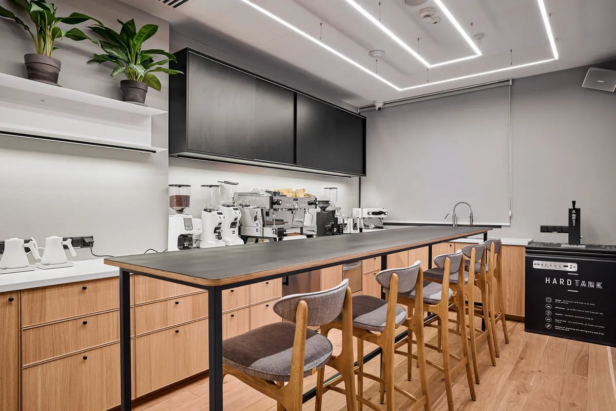 Oprócz zaplecza kawowego przestrzeń wyposażona jest w niezbędne elementy do komfortowej pracy grupowej.